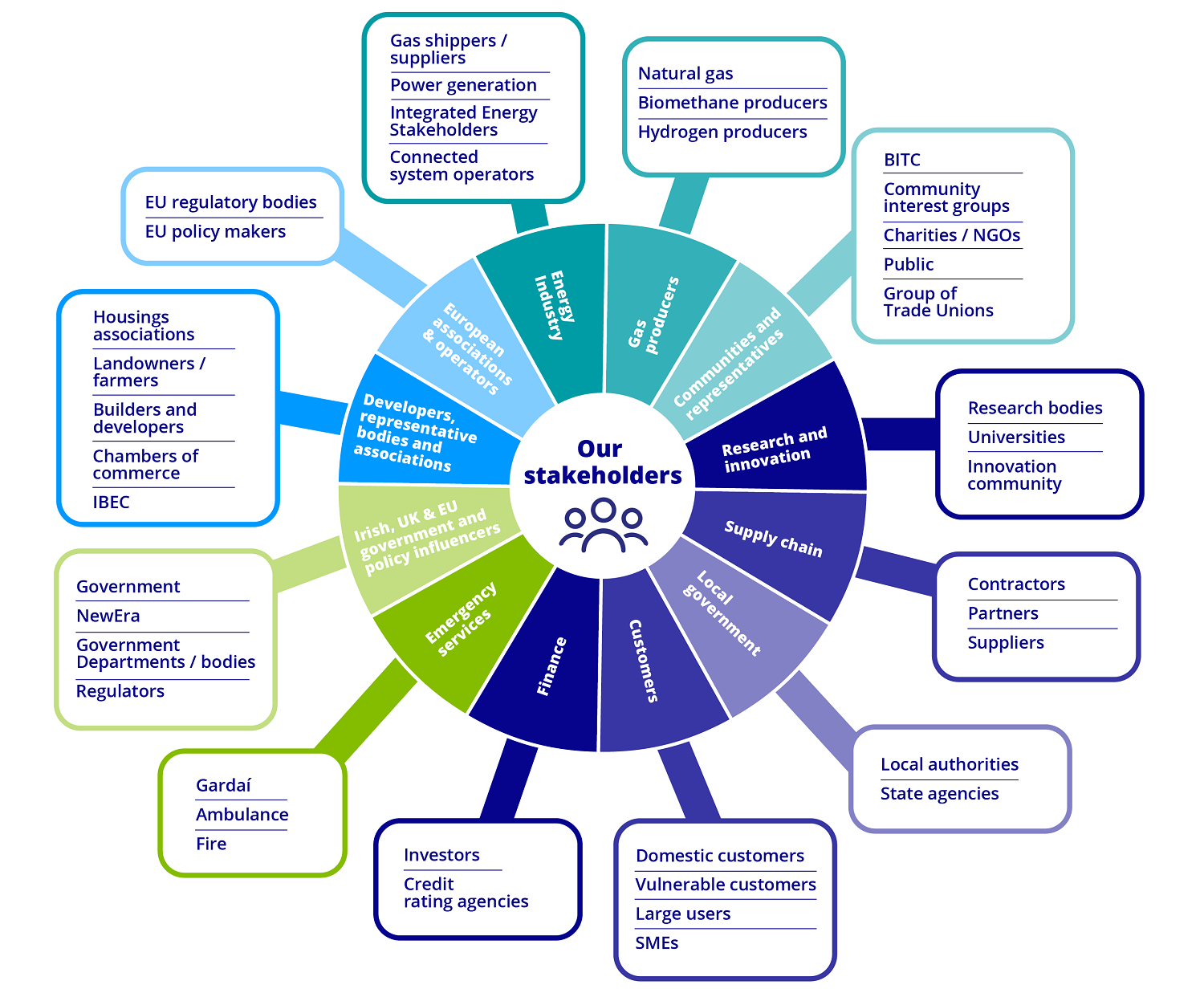 We engage with a wide and diverse range of stakeholders, as illustrated in our Stakeholder Wheel. This includes customers, government departments, regulators, local authorities, emergency services, suppliers, academic institutions, community groups, and EU policy makers. We update our stakeholder mapping annually to ensure we reflect emerging priorities and maintain inclusive engagement practices.