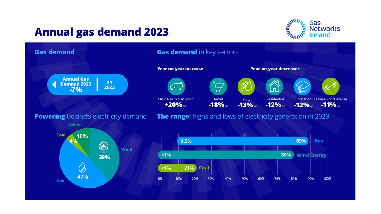 The 2023 Gas Networks Ireland annual demand statement shows that overall demand for gas in Ireland decreased by 7% year-on-year when compared to 2022, due to an increase in energy powered by wind.