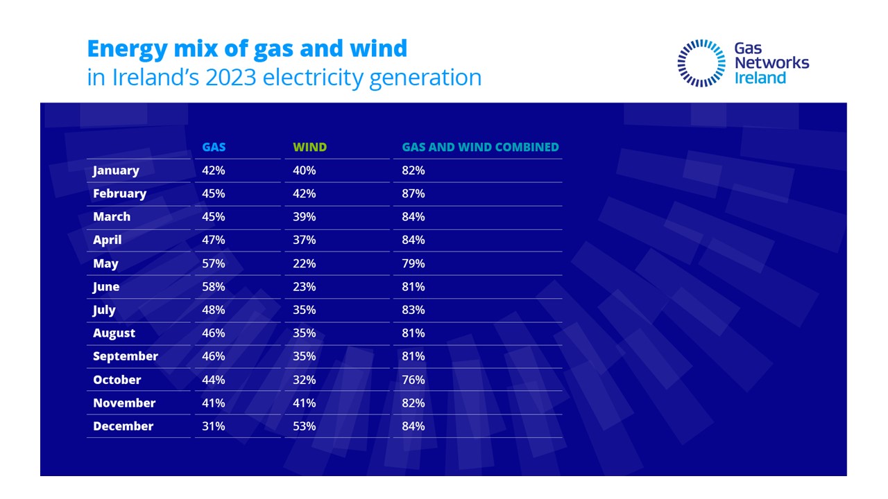 Throughout January to December, there were days each month where wind energy - reliant on weather conditions - could only generate minimum electricity due to calm weather. On those days, gas provided the necessary backbone supplies and overall, in 2023 gas generated the majority (47%) of Ireland's electricity. Overall, when combined, gas and wind energy generated 86% of Ireland's electricity demand."