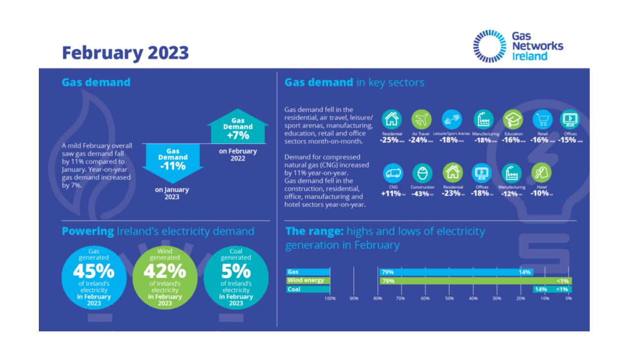 A mild February saw Ireland's overall gas demand fall by 11% compared to January, and decrease by 25% in the residential sector month on month. Year-on-year, gas demand increased by 7%.