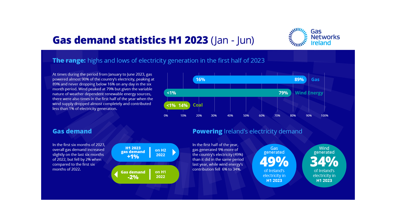 In the first six months of 2023, overall gas demand increased slightly on the last six months of 2022, but fell by 2% when compared to the first six months of 2022.