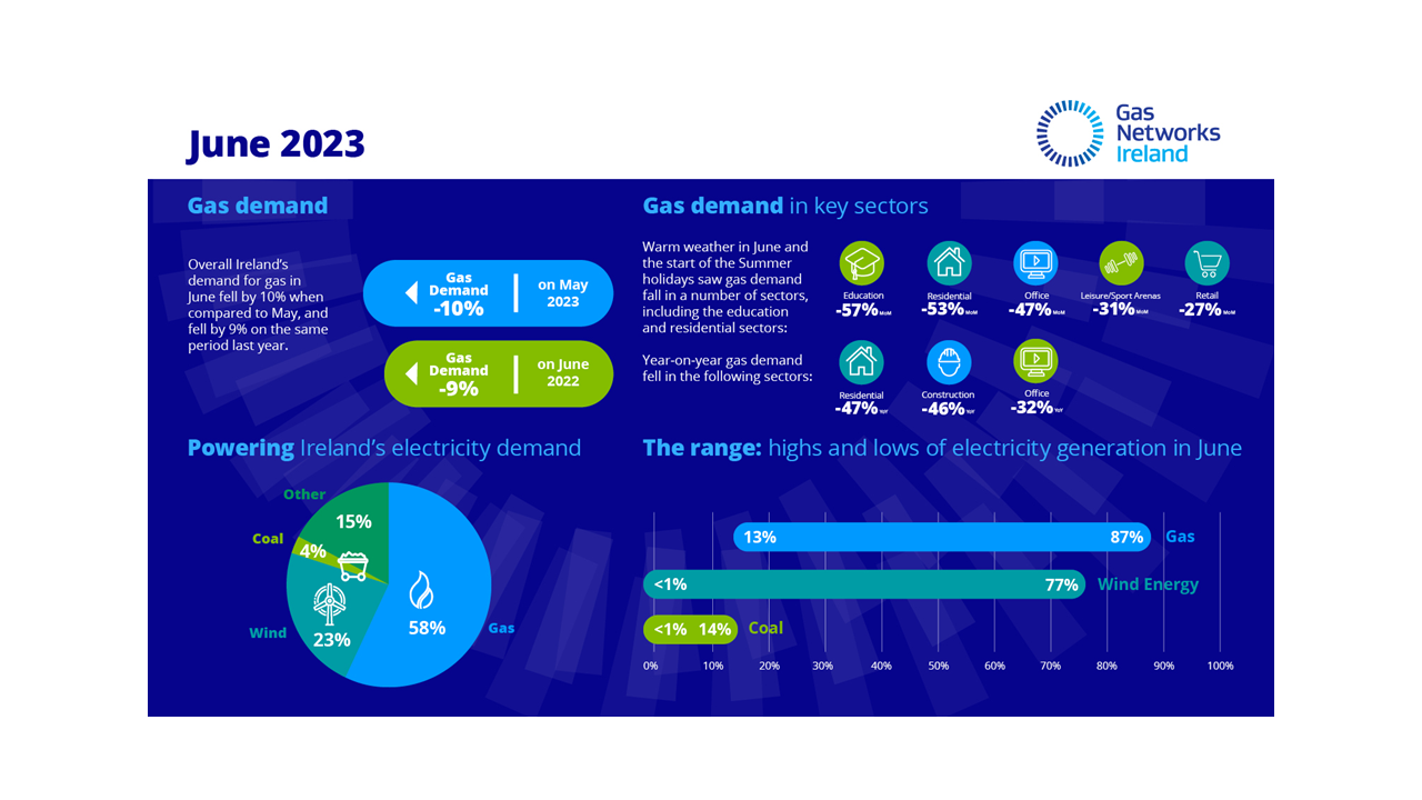 Overall Ireland's demand for gas in June fell by 10% when compared to May, and fell by 9% on the same period last year.