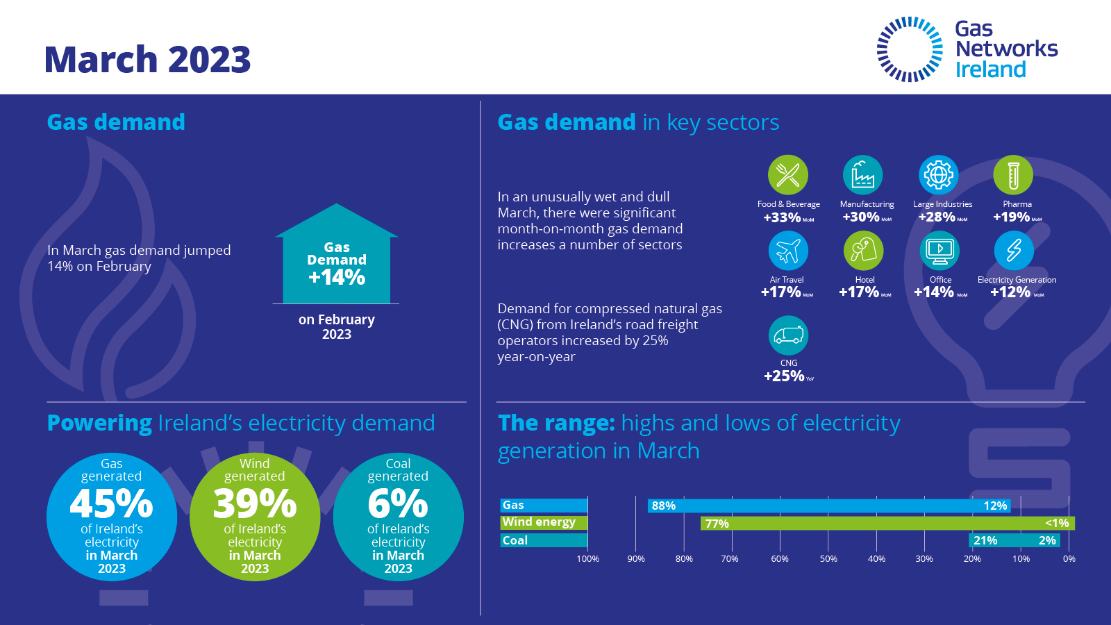 In an unusually wet and dull March, there were significant month-on-month gas demand increases in the food and beverage (+33%), manufacturing (+30%), large industries (+28%), pharma (+19%), air travel1 (+17%), hotel (+17%), office2 (+14%) and electricity generation (+12%) sectors.