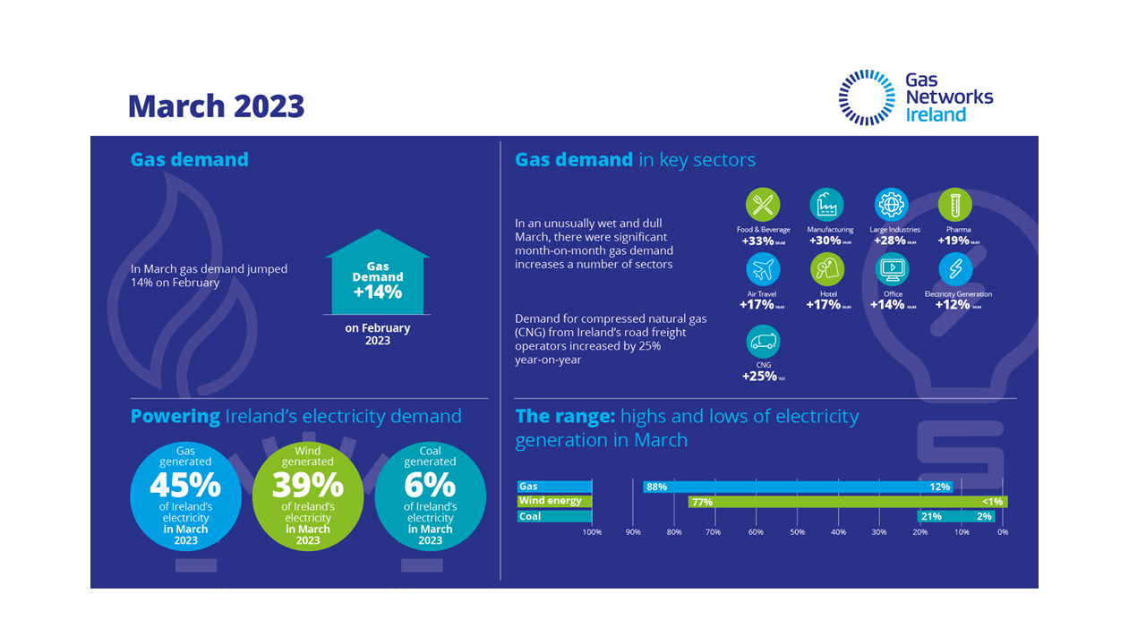 Gas generated 45% of Ireland's electricity as it did in February. At times during the month, gas powered almost 90% of the country's electricity, peaking at 88% and never dropping below 12%.