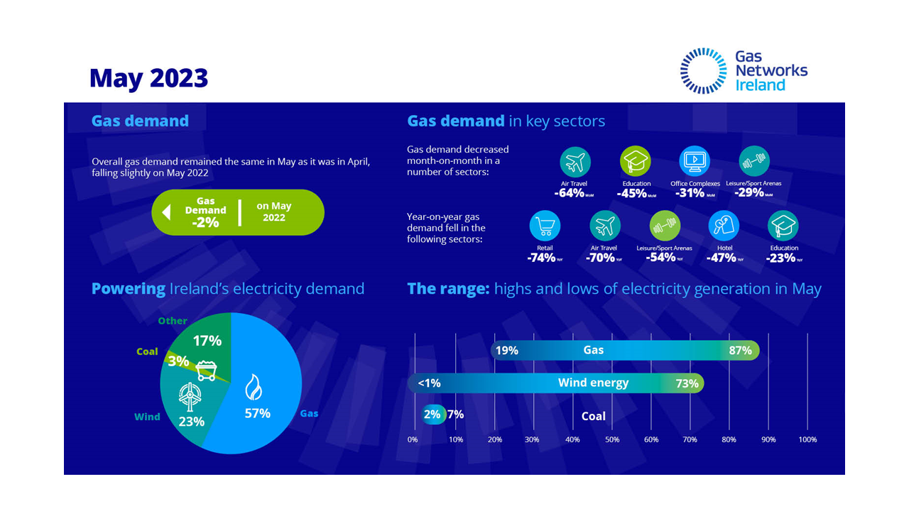 Gas generated 57% of Ireland's electricity in May, up 21% on April (47%) and up 7.5% (53%) compared to the same period last year. In a calm month with little wind, gas provided a much needed back up to compensate for the fall off in wind energy generation.