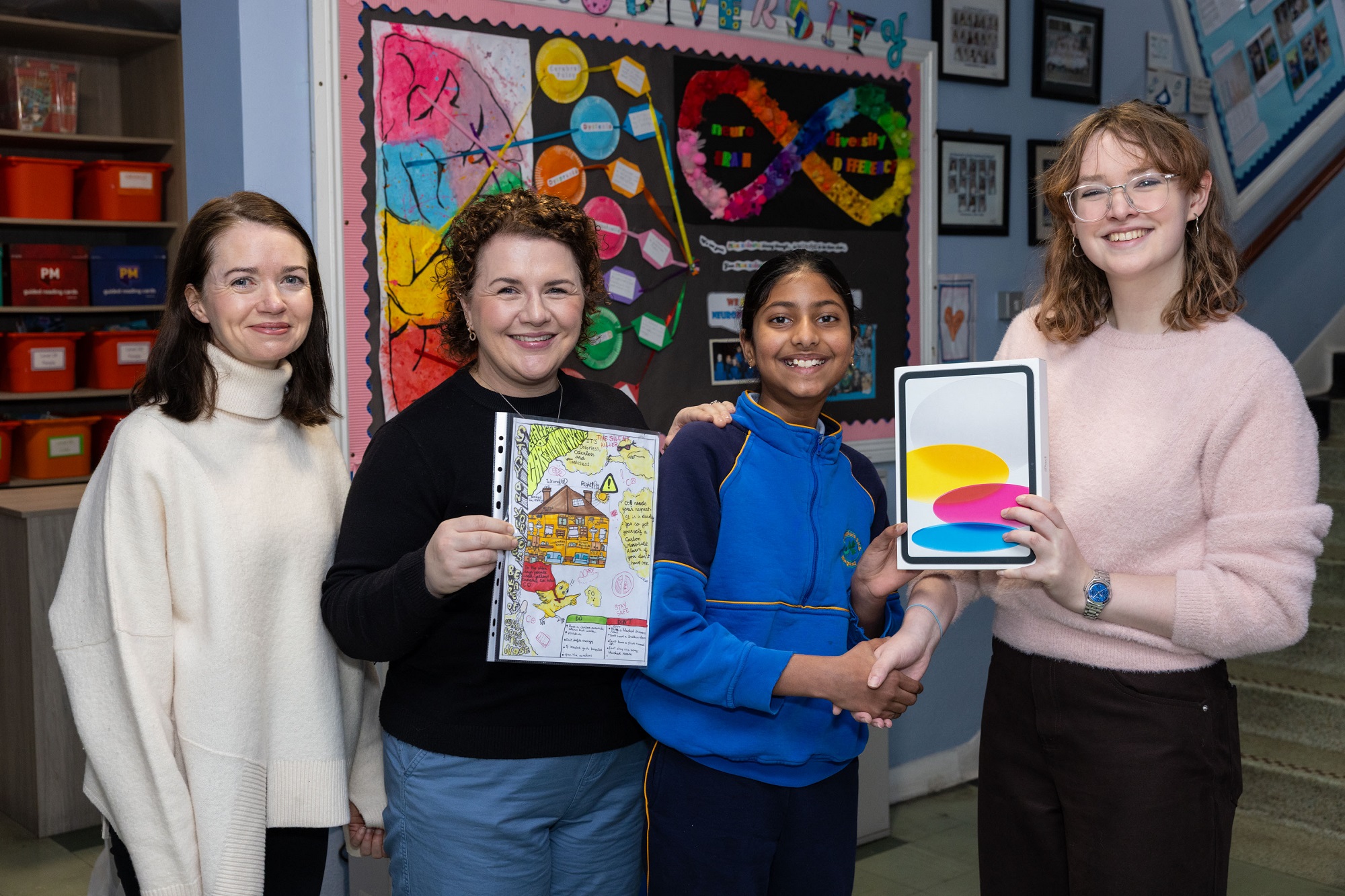 Commenting as she presented St Patrick’s Girls National School with an iPad for their classroom, Gas Networks Ireland’s Sustainability intern Meadhbh Killian said: “We’re thrilled to recognise Samyukta’s poster submission for using creativity to promote an important safety message. Raising awareness about carbon monoxide safety can make a real difference, and this poster does exactly that!”.