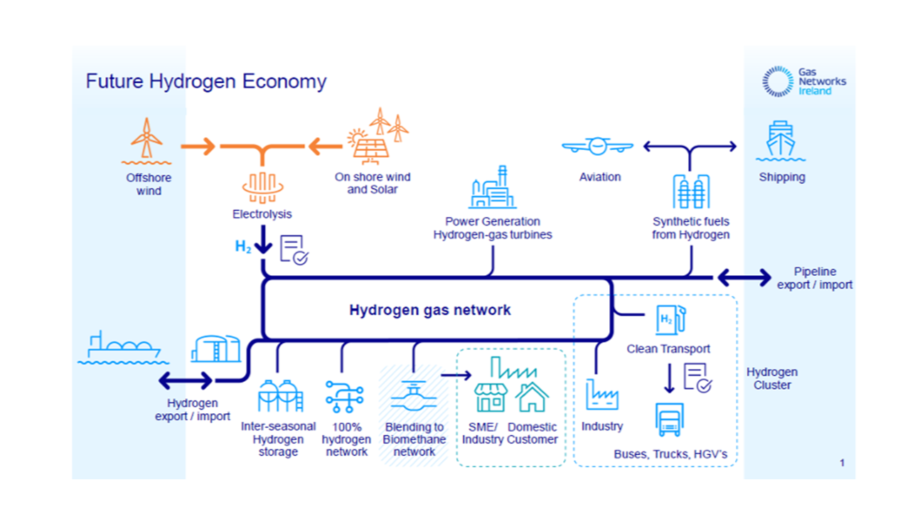 Gas Networks Ireland is committed to supporting Ireland's ambition to achieve net-zero emissions by 2050. The Irish gas network will play a central role in our future clean energy and hydrogen economies by connecting hydrogen production, storage and end-users within hydrogen clusters as they emerge at port locations and at other sites around the country.